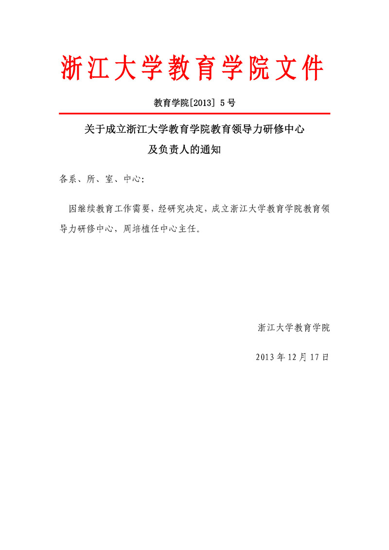 教育学院〔2013〕5号:关于成立浙江大学教育学院教育领导力研修中心及负责人的通...