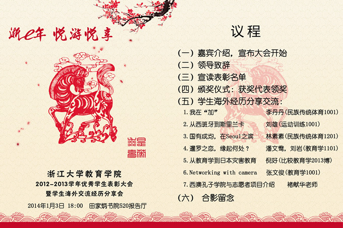欢迎您参加2014年1月3日晚6点在田家炳书院520报告厅举办的教育学院2012-2013学年优秀学生表彰大会暨学生海外经历分享会,让我们一起表彰优秀、见证荣誉、分享经历、激励梦想。
