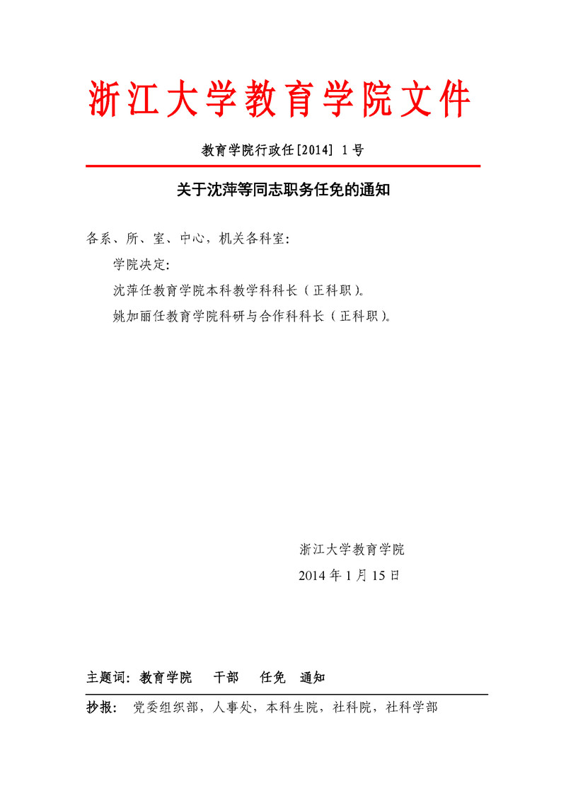 教育学院行政任〔2014〕1号:关于沈萍等任职的通知