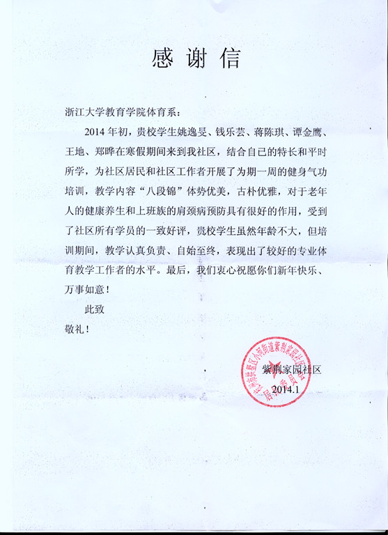 2014年1月寒假伊始,教育学院体育学系民族传统体育专业2012级本科生姚逸旻、王地、谭金鹰、钱乐芸、郑晔、蒋陈琦等同学组成的社会实践小分队走进杭州市拱墅区紫荆花园社区,为社区开展健身气功展示和培训提供了志愿者服务。同学们以“梦想付诸于行动,锻炼中学习思考,行走中践行青春梦想”为宗旨开展了本次社会实践活动,活动得到社区的好评。
