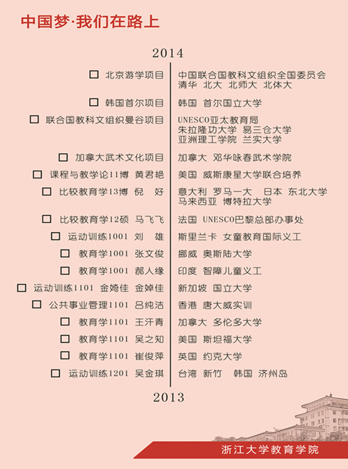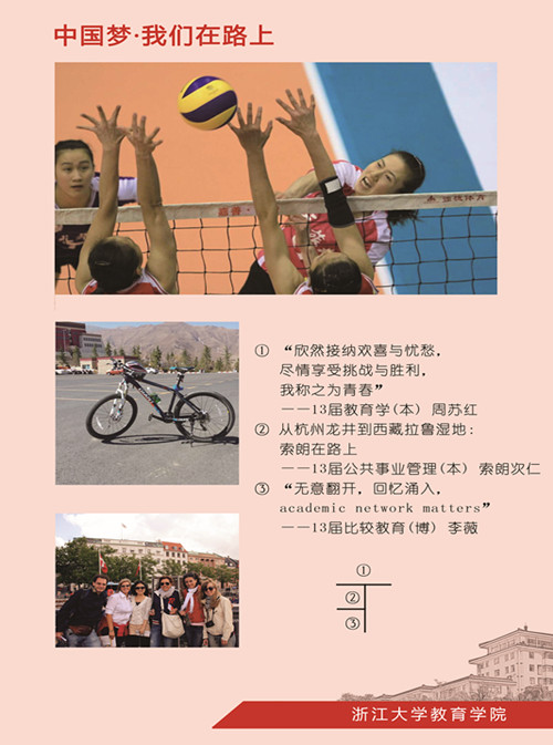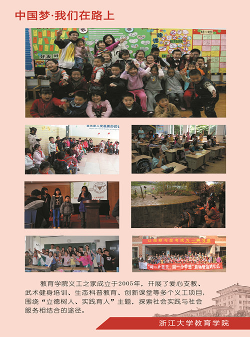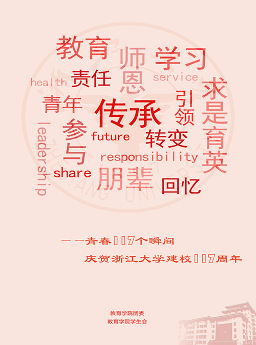 在浙江大学建校117周年之际,教育学院青年师生举办题为“中国梦·我们在路上”——青春的117个瞬间图文分享活动,用承载着青年校友、青年教师和青年学生美好记忆以及能引发大家思考的117张图片,述说一代又一代人在创建世界先进水平教育学院实践探索道路上的共同价值追求,以生动活泼的方式鼓励更多人一起来关注教育,参与教育,推动教育的改革和发展,“做人、做事、做学问”,求是育英、立德树人。