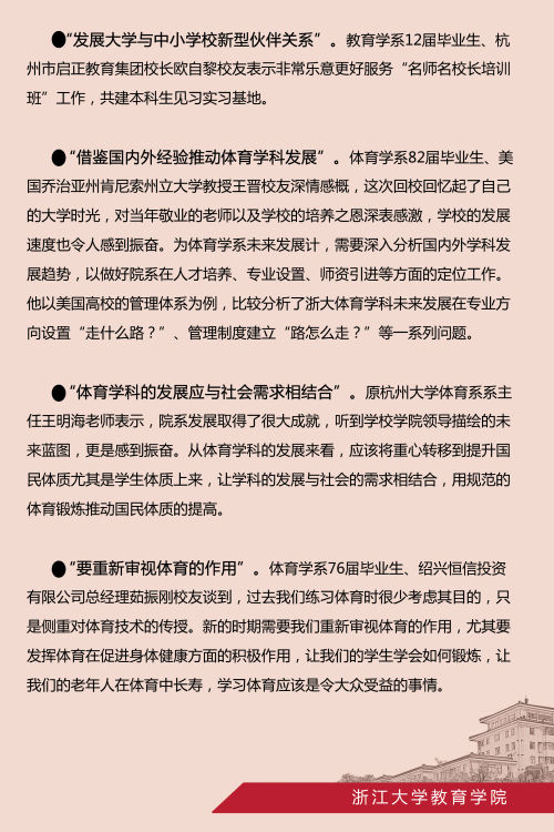 以下,我们收录了校友们教育学系、体育学系座谈会的观点表达,以满足广大“读者”需要——那些因为工作、学习和生活奔波在海内外而未能与会的校友和老师同学,愿意与我们共同推动教育改革发展与人才培养的校内外同志同行。