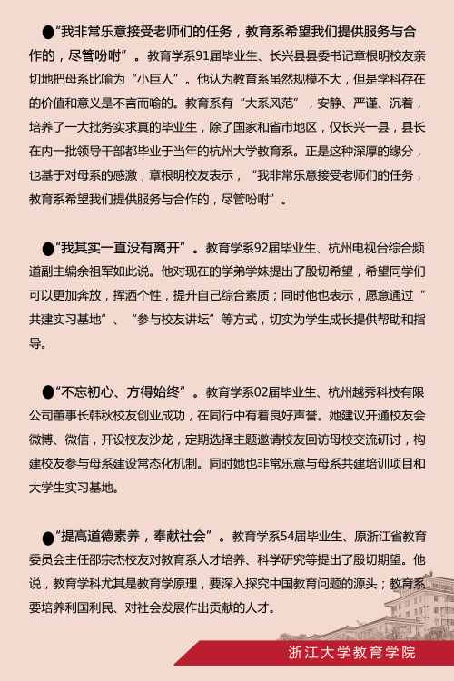 “创新校友机构,推动校友联系常态化和多元化”,比较教育学专业99届毕业生、原杭师大校长林正范校友提出办校友学校等若干设想
