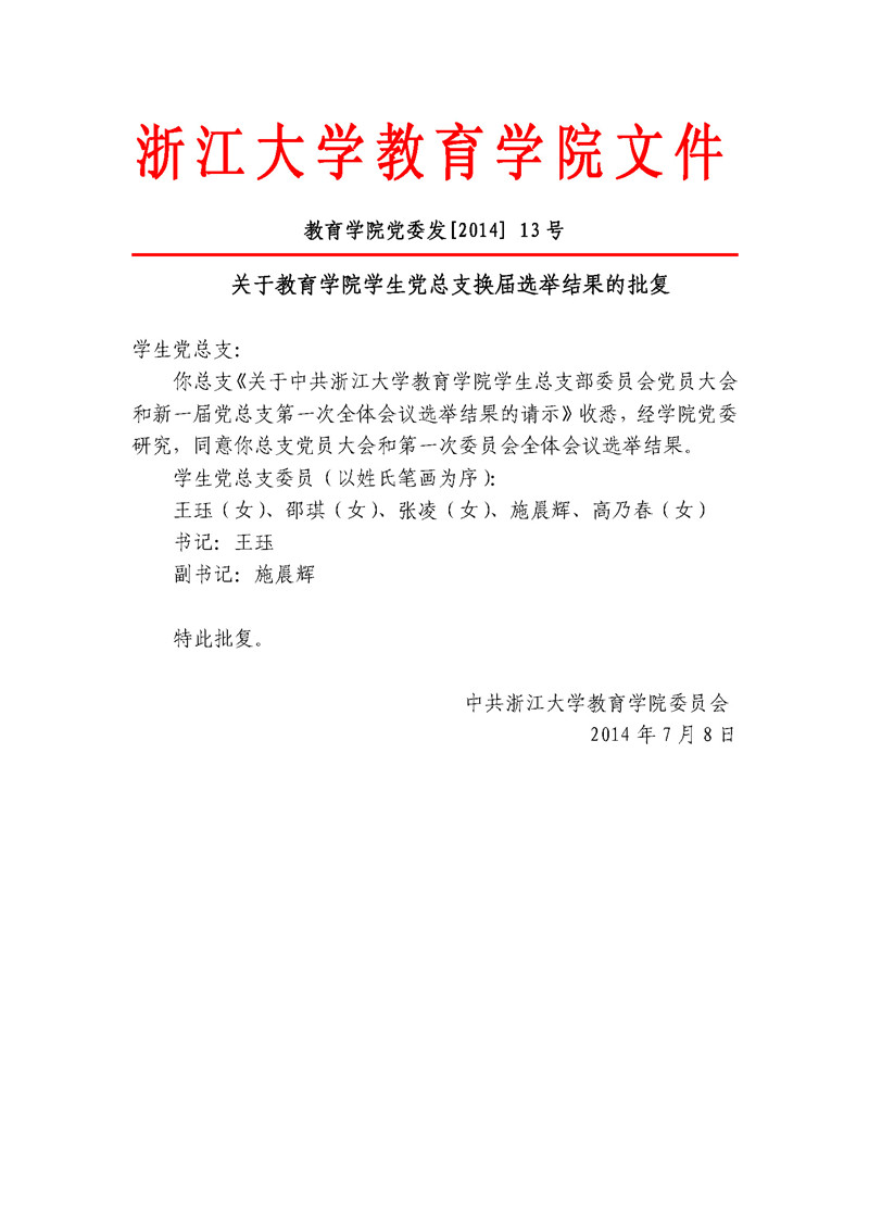 教育学院党委发〔2014〕13号:关于教育学院学生党总支换届选举结果的批复