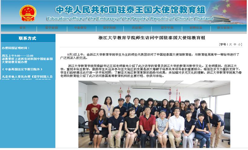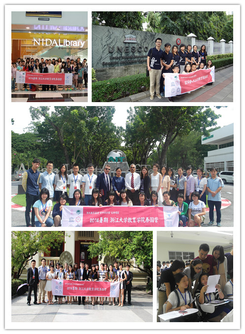 图3-4教育学院第二期泰国营, 跨院系11个专业22名同学经选拔访学UNESCO Bangkok, Chula U, Chiang Mai U, SWU, AIT, NIDA, PIM等,学院党委副书记王珏、青年教师联谊会成员高乃春老师任本期指导。UNESCOD主管APEID项目汪利兵主任,中国驻泰使馆教育组周高宇一等秘书及华人学者学生联合会齐新建主席等给予积极协助。2014项目经申报评审获浙大教育基金会“安中”基金支持。
