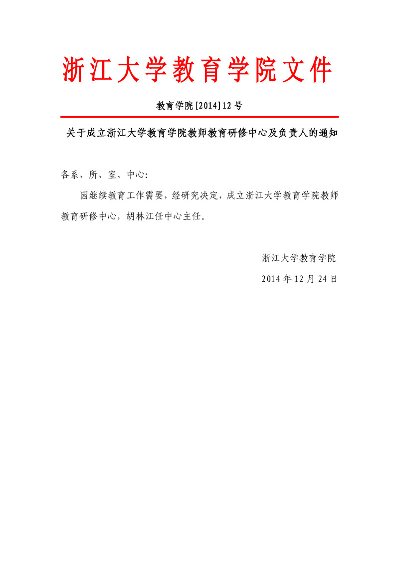 教育学院〔2014〕12号:关于成立浙江大学教育学院教师教育研修中心及负责人的通...