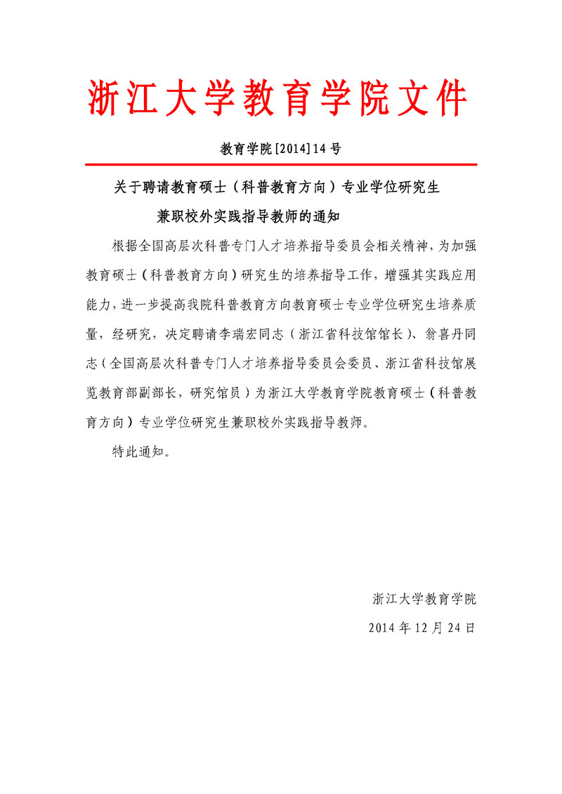 教育学院〔2014〕14号:《关于聘请教育硕士(科普教育方向)专业学位研究生兼职...