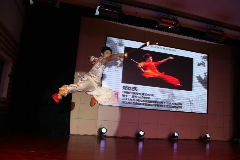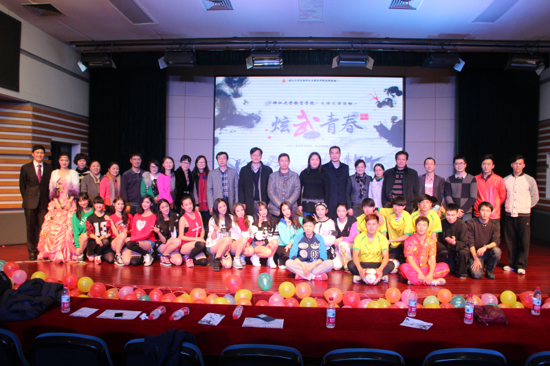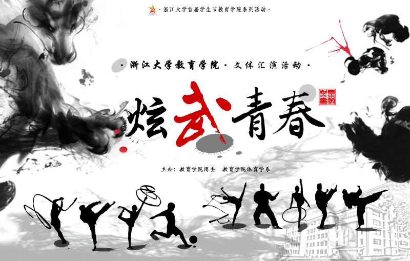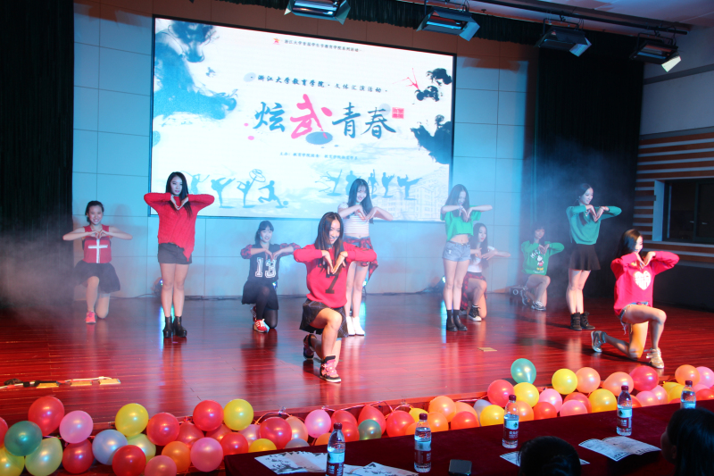 2014年12月30日晚,教育学院“炫舞青春”文体汇演在紫金港临水报告厅隆重举行。本次汇演由教育学院团委、教育学院体育系主办,作为浙江大学首届学生节系列活动之一,汇演以“文武结合,动静皆宜;求是育英,立德树人”、“健康、快乐、成长、梦想”为主题,展现了教育学院师生的风采。