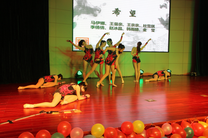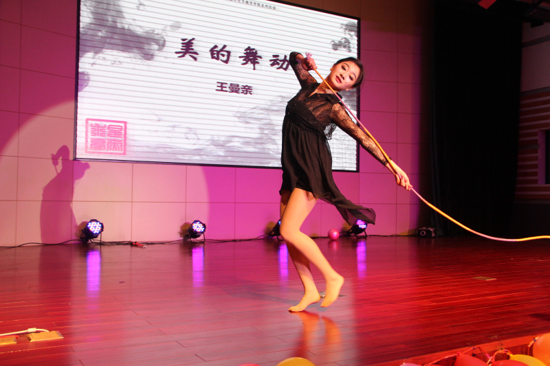 浙大艺术体操队由教育学院独立培养,2015年7月他们将参加世界大学生运动会。迈着轻盈的步伐,艺术体操的姑娘们为观众带来的结合艺术体操道具棒、带、圈、绳、圈的舞蹈《希望》《律动》《美的舞动》《I Got a Boy》。曼妙的舞姿配合巧妙的编排,轻拢慢捻的舞步,高抛接起的技巧,花式队形的转换,整段舞蹈中观众不断的叫好鼓掌,这也是对姑娘们辛勤排练最好的回赠。而后,艺术体操指导老师单亚萍上台,向同学介绍艺术体操队骄人的成绩与平时训练的点滴故事。