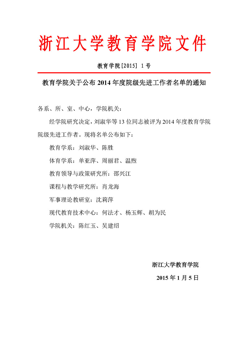教育学院〔2015〕1号:教育学院关于公布2014年度院级先进工作者名单的通知