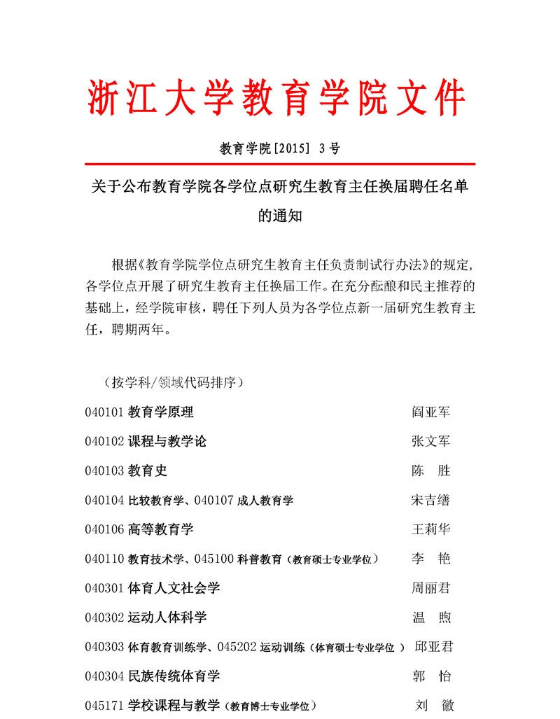 教育学院〔2015〕3号:关于公布教育学院各学位点研究生教育主任换届聘任名单的通...
