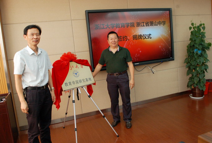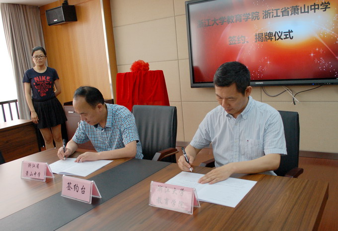 为加强基础教育与高等教育的有效衔接与合作交流,推动浙江省萧山中学教育事业全面、优质、均衡、可持续发展。2015年6月24日下午浙江大学教育学院与浙江省萧山中学签约揭牌仪式在萧山中学举行。浙江大学本科生院招生处有关领导、浙江大学教育学院领导、萧山教育局领导、萧山中学领导、双方合作项目负责人及相关科室人员出席了此次仪式,会议由萧山中学沈朝晖副校长主持。
