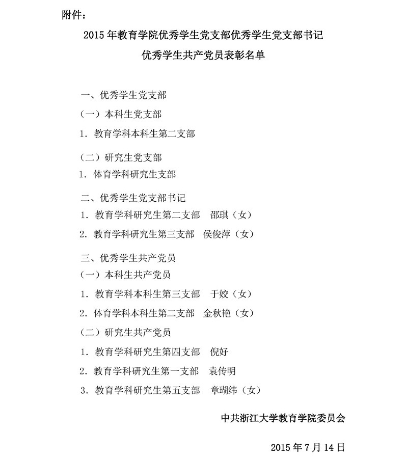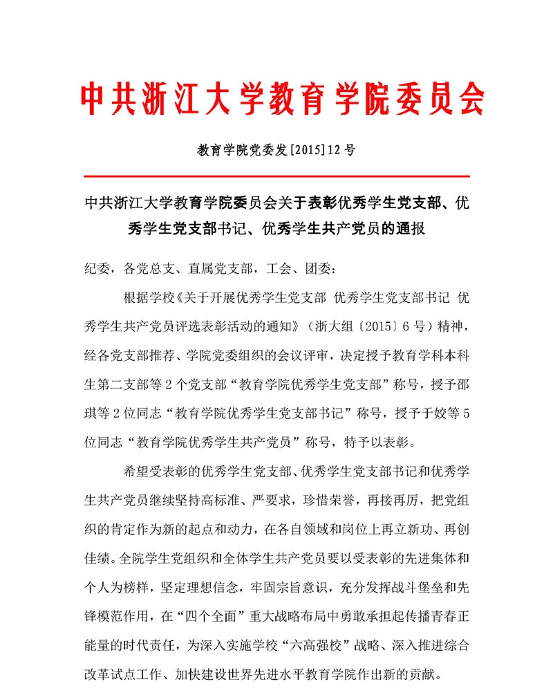 教育学院党委发〔2015〕12号:中共浙江大学教育学院委员会关于表彰优秀学生党支部、优秀学生党支部书记、优秀学生共产党员的通报
