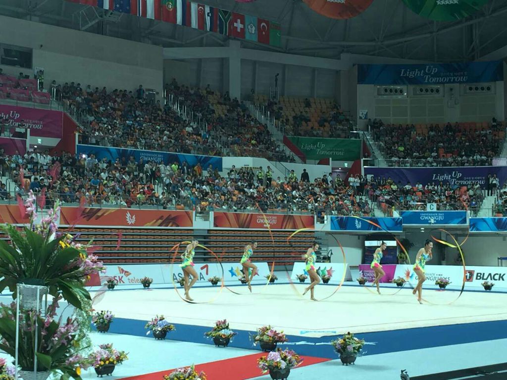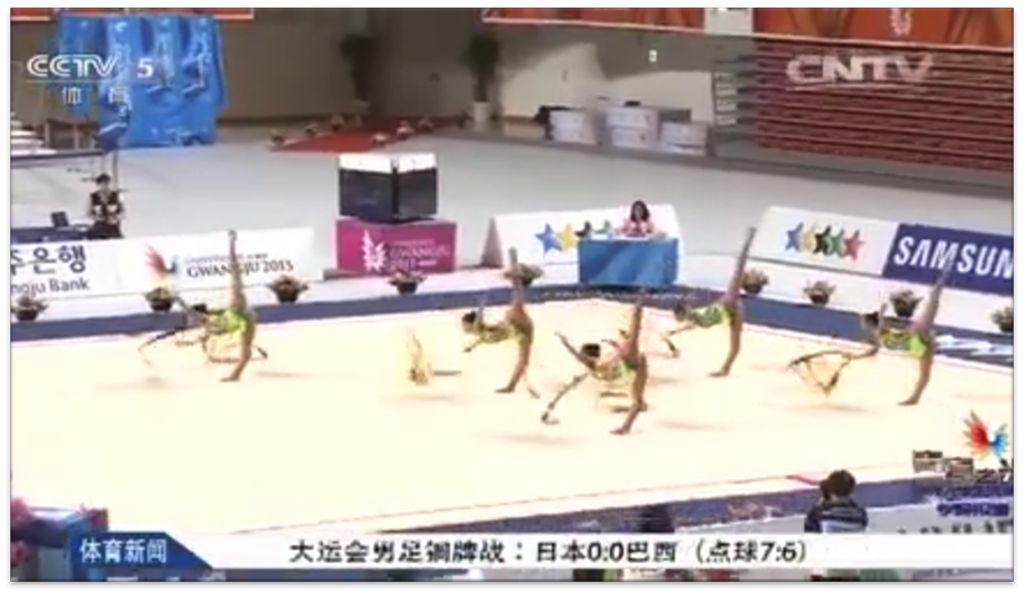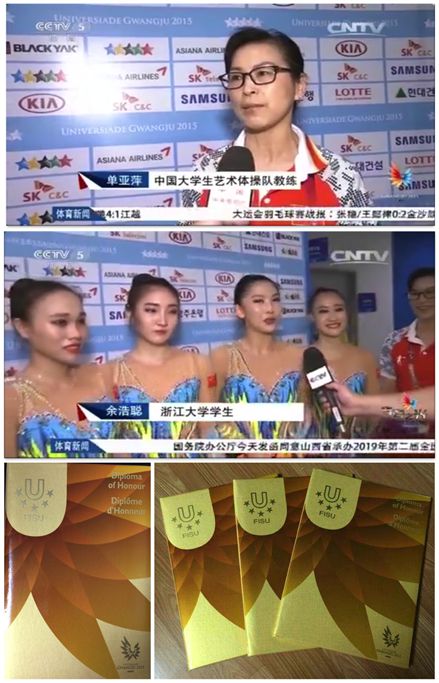 “点亮明天”:在刚结束的第28届世界大学生运动会上,浙大学子为中国军团赢得艺术体操集体全能第五、集体单项五带第五和集体单项6棒2圈第五。