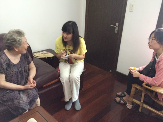 队员陈宁和郝人缘在老浙大社区采访今年“最美小营”候选人