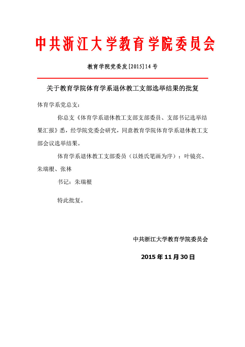 教育学院党委发〔2015〕14号:关于教育学院体育学系退休教工支部选举结果的批复