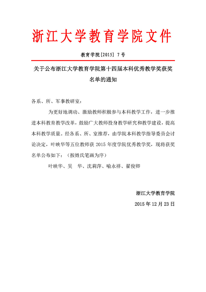 教育学院〔2015〕7号:关于公布浙江大学教育学院第十四届本科优秀教学奖获奖名单...