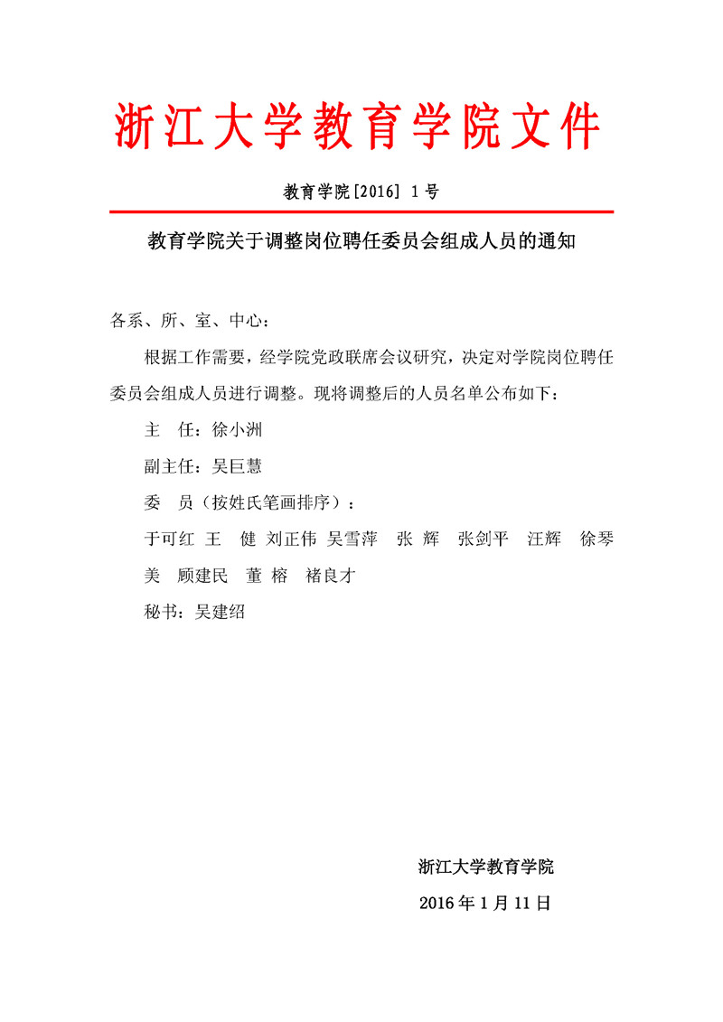 教育学院〔2016〕1号:教育学院关于调整岗位聘任委员会组成人员的通知