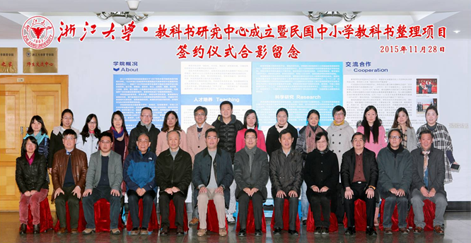 2015年11月28日,浙江大学教科书研究中心成立暨民国中小学教科书整理项目签约仪式在浙江大学西溪校区田家炳书院520报告厅举行。浙江大学教育学院副院长于可红教授主持仪式。浙江大学社会科学研究院院长余逊达教授宣读了浙江大学关于成立浙江大学教科书研究中心的通知,浙江大学副校长罗卫东教授为浙江大学教科书研究中心揭牌。