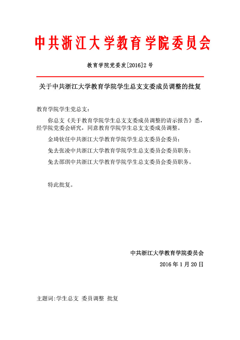 教育学院党委发〔2016〕2号:关于中共浙江大学教育学院学生总支支委成员调整的批复