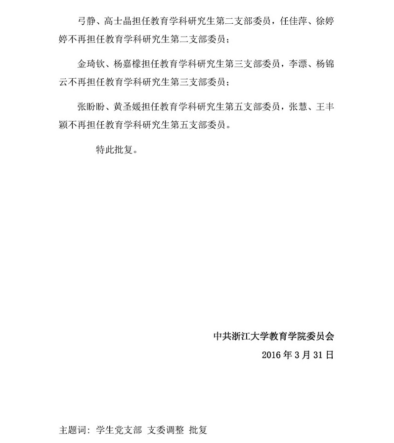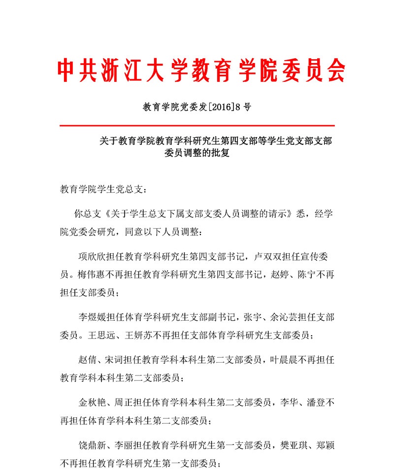 教育学院党委发〔2016〕8号:关于教育学院教育学科研究生第四支部等学生党支部支部委员调整的批复