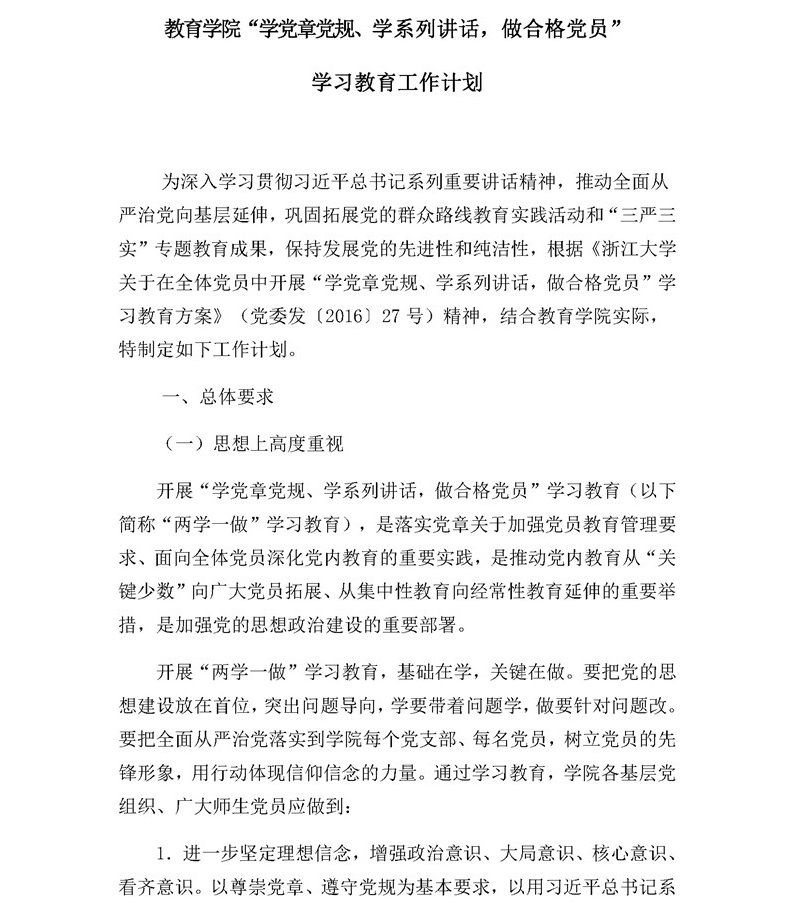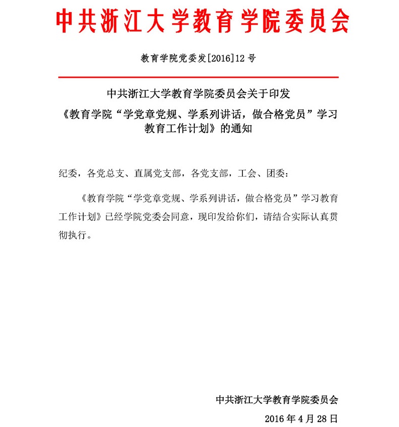教育学院党委发〔2016〕12号:中共浙江大学教育学院委员会关于印发《教育学院“学党章党规、学系列讲话,做合格党员”学习教育工作计划》的通知