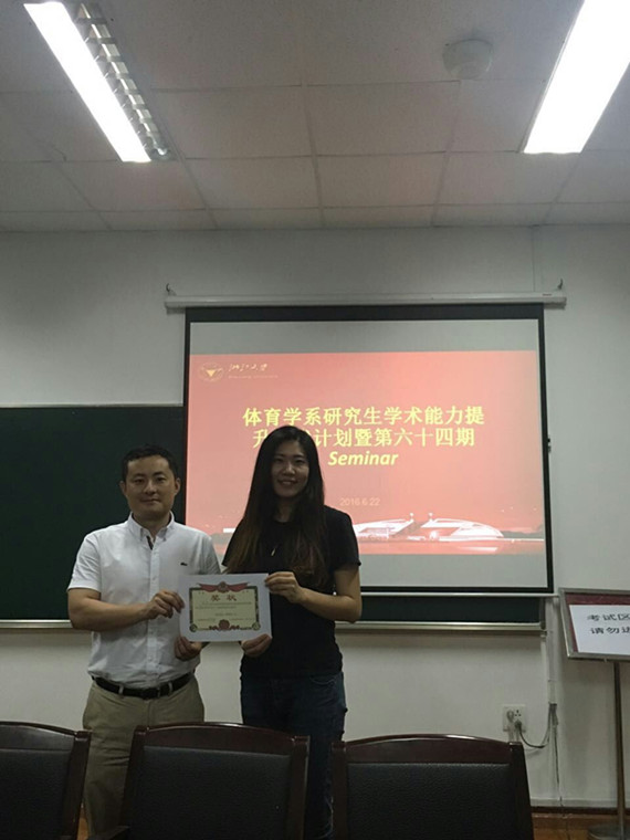 本期活动由2015级的三位硕士研究生同学主讲,他们分别将各自毕业论文初步设想与老师和同学进行了讨论。2015级运动训练专业硕士研究生宁欣以《绿色锻炼对身心健康的影响研究》为题,向老师和同学们介绍了目前关于绿色锻炼的研究现状以及研究存在的不足,并将自己的研究设计与研究假设与同学们做了分享;2015级运动训练专业硕士研究生王健以《大学生步行消耗及锻炼建议》为题,疏理了国内外研究现状,并提出自己的研究设想,着手以浙江大学学生为例,探究大学生步行消耗对健康的影响及提出合理建议;2015级运动训练专业硕士研究生张宇以《跳远运动员的专项力量研究》为题,介绍了跳远运动员所需的专项力量及专项力量对运动成绩的重要性,拟以浙江大学高水平田径队跳远组为例,探究跳远运动员专项力量训练的方法。