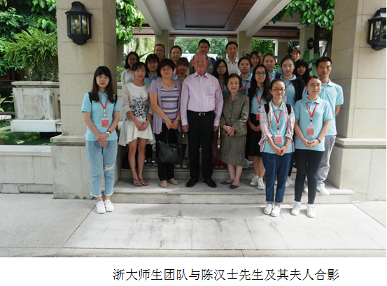 本次交流活动中,师生团还专程拜访了著名侨领陈汉士老先生。陈汉士先生是泰国华人企业家,是泰中友好协会副会长。他非常欢迎浙大师生团的到访,还准备了精致的点心热情招待师生,并把自己的创业史和奋斗史向大家娓娓道来,讲述自己如何从一个贫穷的打工仔转变为如今的“金枪鱼大王”,激励同学们自强不息、努力拼搏。陈汉士先生虽身居泰国,却时时心系祖国,他多次饱含深情地告诉同学们不要忘本,真挚的爱国情怀让师生们深受感动。