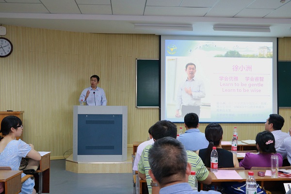 激动人心的教育学院介绍视频过后,院长徐小洲老师首先代表教育学院欢迎新生的到来,并发表迎新演讲。徐老师认为,学会优雅、学会睿智,是教育学子应有的素质。第一,learn to be gentle。在推进社会文明的过程中,绅士教育有许多值得借鉴的地方,并且在一定程度上和儒家文化是异曲同工的。优雅不仅要讲礼仪,懂道理,更要在言和行中体现出来,付诸实践。第二,learn to be wise。智慧需要我们用心去涵养认知。教育并不遥远,教育学子要用教育者的思维思考问题,用睿智之心去对待身边的人,处理遇到的事。最后,徐老师祝愿新生能在未来的学习进程中克服困难,学会成长,学会担当,保持优雅和睿智,用更好的自己去创造更好的社会。