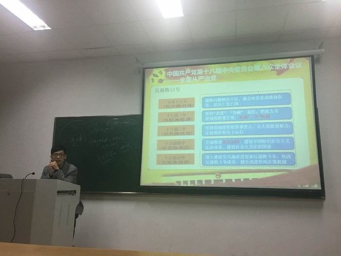 支部宣传委员周正基于十八届六中全会公报内容,从全面从严治党切入,为支部党员、入党积极分子讲党课。他首先就十八大——十八届六中全会上所提的反腐败政策与口号进行了介绍,接着带领与会成员加深了对我党反腐败进程的了解,重点推荐了中纪委与央视联合推出的专题片《永远在路上》。最后,他运用数据与图表展示了反腐的特点,并提出,从“不敢腐”到“不能腐”需要一个与时俱进的监察体制。
