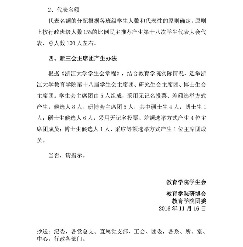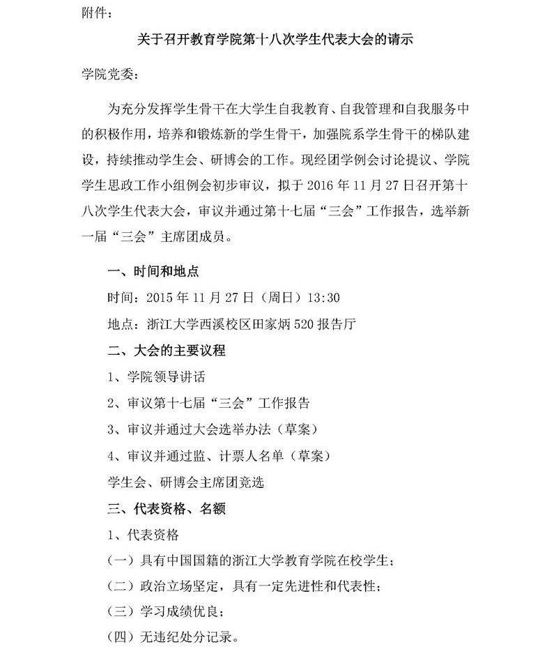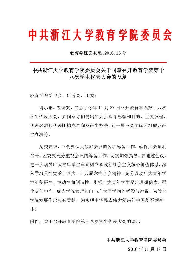教育学院党委发〔2016〕15号:中共浙江大学教育学院委员会关于同意召开教育学院第十八次学生代表大会的批复