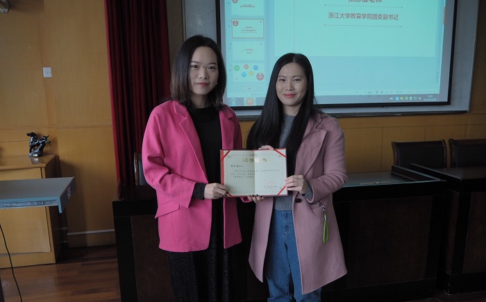 此后,浙江大学教育学院团委副书记张静波致辞。首先她对学生干部们提出了几点要求:一.学生干部要通过自律来带动他律,以身作则,平衡学业与学生会工作,用更高的要求来要求自己。二.新成员应当珍惜来到学生会的宝贵机会,展现最优秀的自我。努力总会被人看到。三.强调学生会是一个网格状架构,彼此是一个层层递进的关系。张静波老师的话为学生工作的开展指明了方向,令在场的每一位同学都深受鼓舞与启发。最后张静波老师为上一届学生会主席项玲连颁发荣誉证书,感谢其为学生会所做的贡献同时为第十八届学生会主席团成员颁发寄予满满希望的荣誉聘书。
