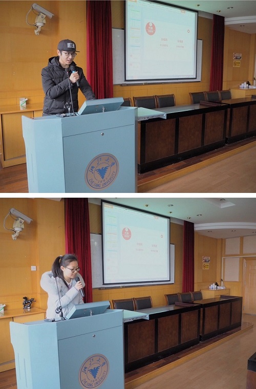 (图为部长代表孙佳风同学,干事代表张玮逸同学上台发言)