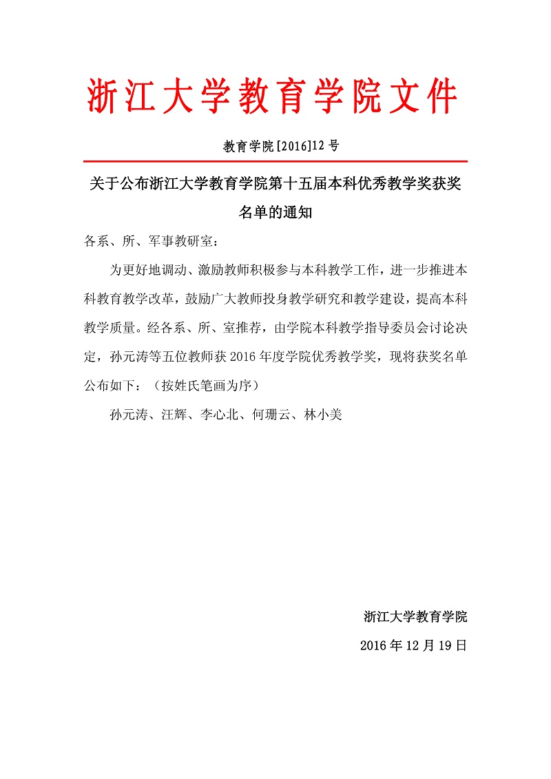 教育学院〔2016〕12号:关于公布浙江大学教育学院第十五届本科优秀教学奖获奖名...