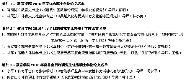 根据《教育学院研究生优秀学位论文评选办法(试行)》,经学科学位评定委员会投票评选通过,共评选出2016年度(2015年9月1日至2016年8月31日)优秀博士学位论文2篇、全日制研究生优秀硕士学位论文3篇、非全日制研究生优秀硕士学位论文2篇,名单如下(按姓氏笔画排序)。现将评选结果公示一周,公示期从2016年12月26日起至12月30日结束。