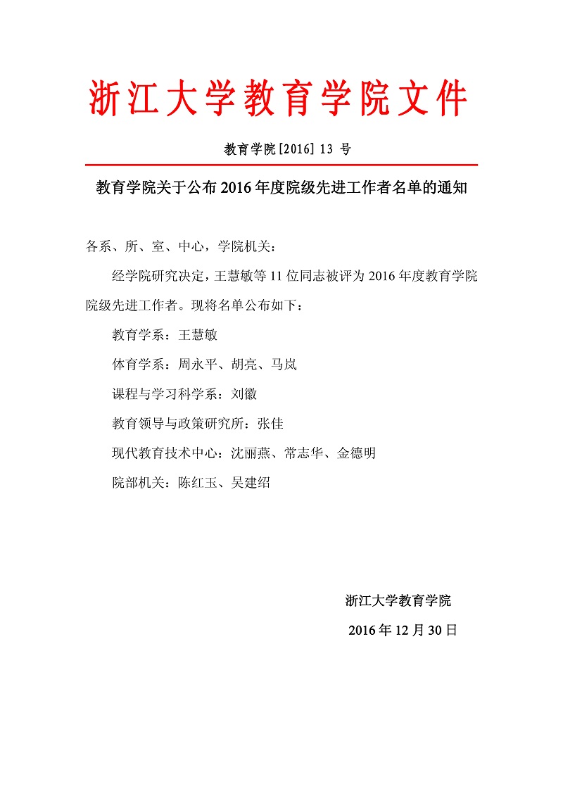 教育学院〔2016〕13号:教育学院关于公布2016年度院级先进工作者名单的通知