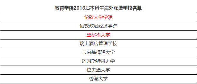 2016届本科生中,共有32名同学升学,海内升学24人,海(境)外升学8人,海内外升学率为32.32%。在24名海内升学的同学中,18名同学保研浙江大学,1名同学保研至清华大学,1名同学保研至北京师范大学,还有2名保研至华东师范大学;另外还有2名同学分别考入宁波大学和中南大学。下面是海外升学的情况: