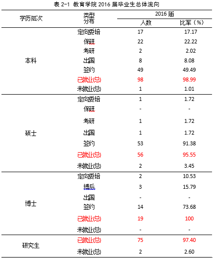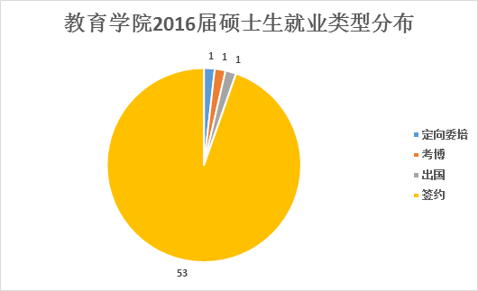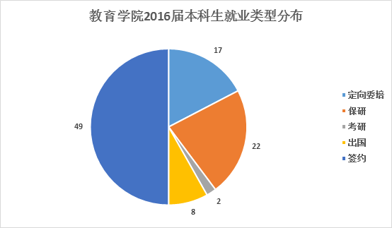 在就业大体流向上,教育学院2016届本科生主要以签约就业、升学等方式落实毕业去向,升学人数中保研占绝大多数。