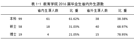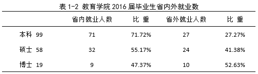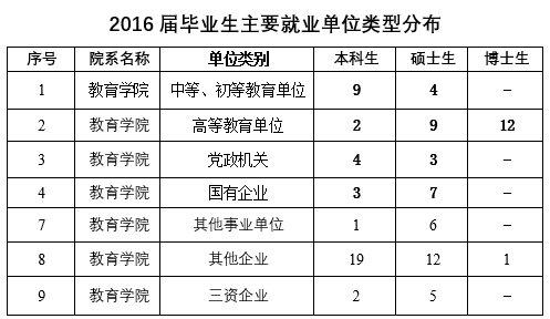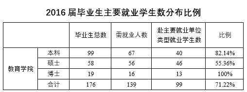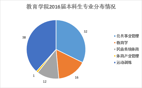2016年,教育学院应届毕业生176人,主要分布在公共事业管理、教育学、民族传统体育、体育产业管理、运动训练5个本科专业,以及比较教育学、成人教育学、高等教育学、教育技术学、教育史、教育学原理、教育硕士、课程与教学论、体育人文社会学、运动人体科学、运动训练11个研究生专业。