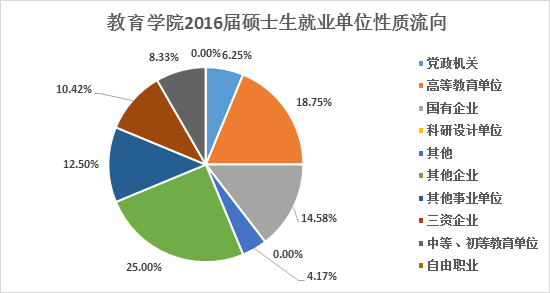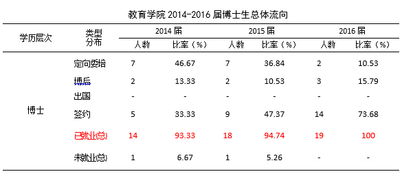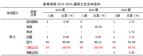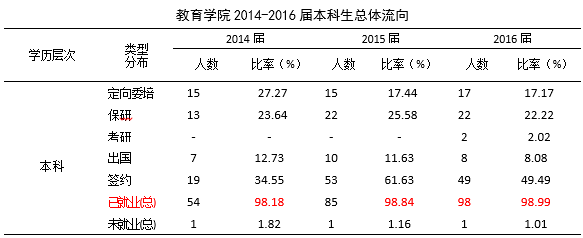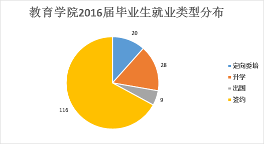 在就业大体流向上,教育学院2016届全体毕业生主要以签约就业、升学等方式落实毕业去向。