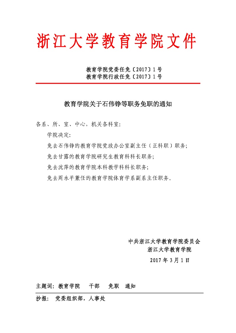 教育学院行政任免〔2017〕1号:教育学院关于石伟铮等职务免职的通知
