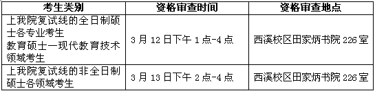 考生必须通过学院统一进行的资格审查(详见下表安排),并请按附件三《教育学院关于2017年硕士研究生报考资格审查的通知》、附件五《教育学院2017年硕士研究生报考资格审查材料清单》规定的要求准备好各项材料。本校应届考生参加复试无需资格审查。