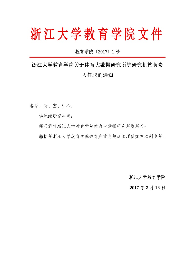 教育学院〔2017〕1号:浙江大学教育学院关于体育大数据研究所等研究机构负责人任...