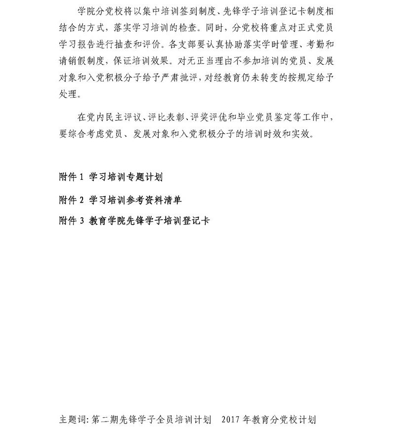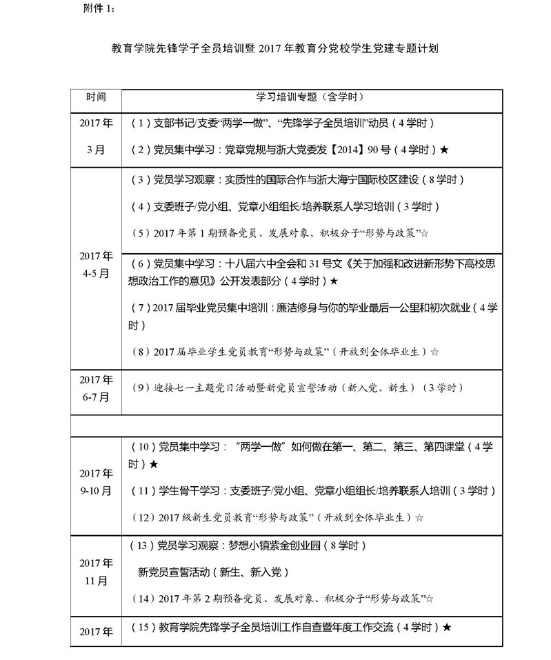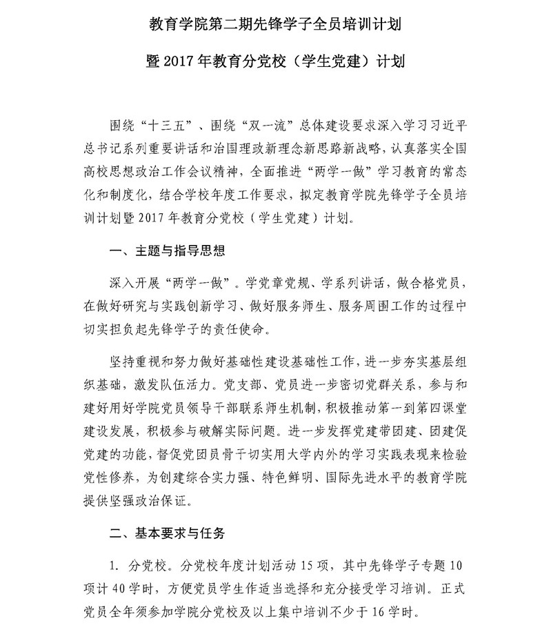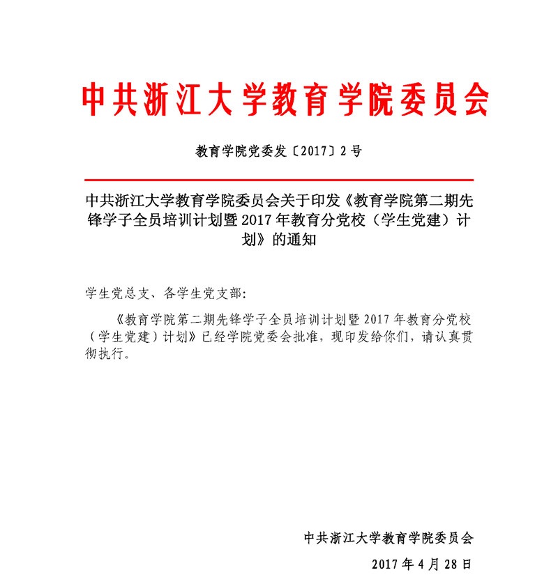 教育学院党委发〔2017〕2号:中共浙江大学教育学院委员会关于印发《教育学院第二期先锋学子全员培训计划暨2017年教育分党校(学生党建)计划》的通知