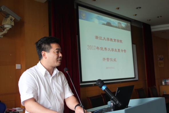 学院党委书记、副院长吴巨慧老师致欢迎辞。他代表教育学院对同学们的到来表示热烈的欢迎。吴书记说,杭州有两张金名片,一张是西湖,一张是浙江大学。浙江大学的美丽与西湖之灵韵交相辉映,“一湖一校”成就了杭州的美丽、精致与灵气,促进了杭州的创新与包容,也推动了浙江省的经济发展。他从人才培养目标、学科与就业等方面介绍了教育学院的办学历史及特色。他祝愿各位同学在两天的夏令营中有所收获,有所成长,并通过此次夏令营实现梦想,顺利来到杭州,来到浙江大学。