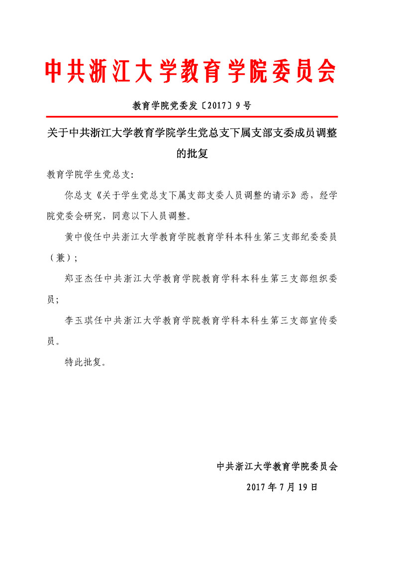 教育学院党委发〔2017〕9号:关于中共浙江大学教育学院学生党总支下属支部支委成员调整的批复