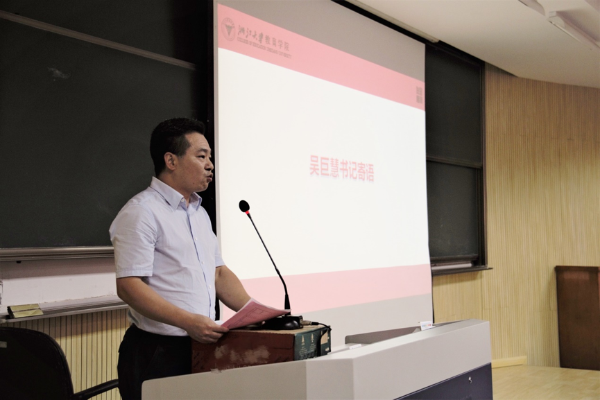 接着,15级运动训练专业杨华昕同学作为学长代表发言,他不仅是学院学生会副主席同时也担任校学生会副主席。杨华昕学长以自身经验分享在“在浙里五不要”与大家共勉:不要害怕尝试和探索、不能没有责任和担当、不要忘记历史和初心、不要停止学习和反思以及不要忘记健康和家人。17级比较教育学的直博生张萌作为新生代表发言。她表达了对即将开启的研究生学习和生活的期待以及努力奋斗的决心,并祝愿同学们有一个充实而无悔的大学生活。