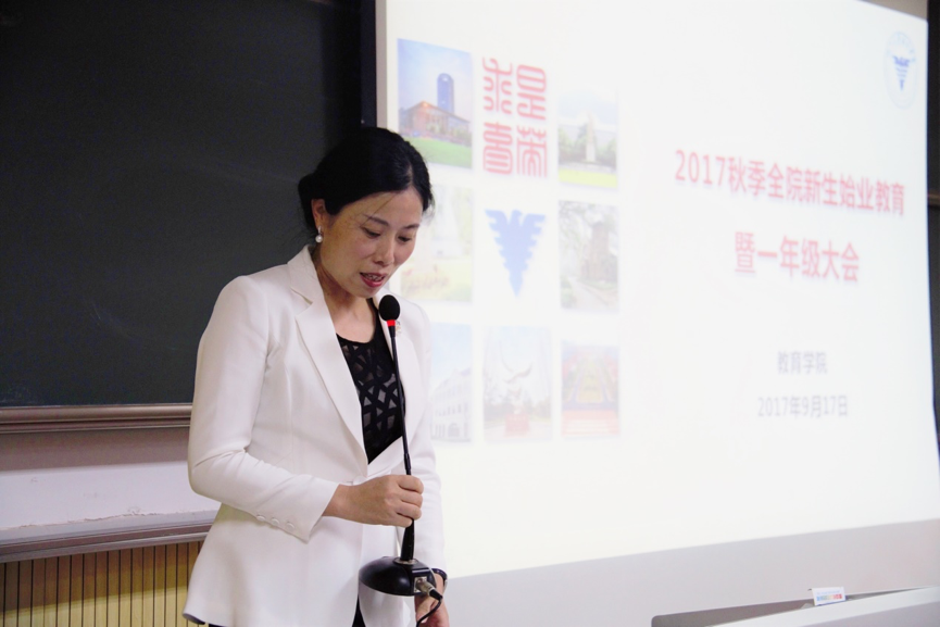 2017年9月17日下午,在浙江大学西溪校区田家炳书院301,一张张新鲜的面孔,带着些许的期待齐聚一堂。教育学院2017秋季全院新生始业教育暨一年级大会在此举行, 17级本研共计239名新生参加。学院党政班子成员、系所培养单位主要负责人、分管学生工作负责人、学位点负责人、研究生德育导师、本科生班主任、研究生科、本科生科负责人、学生党总支、辅导员、学生团总支、三会主席团和2017级学长组出席了本次迎新活动,共同为2017级的新生们揭开新的人生序幕。本次大会由学院党委副书记包松老师主持。