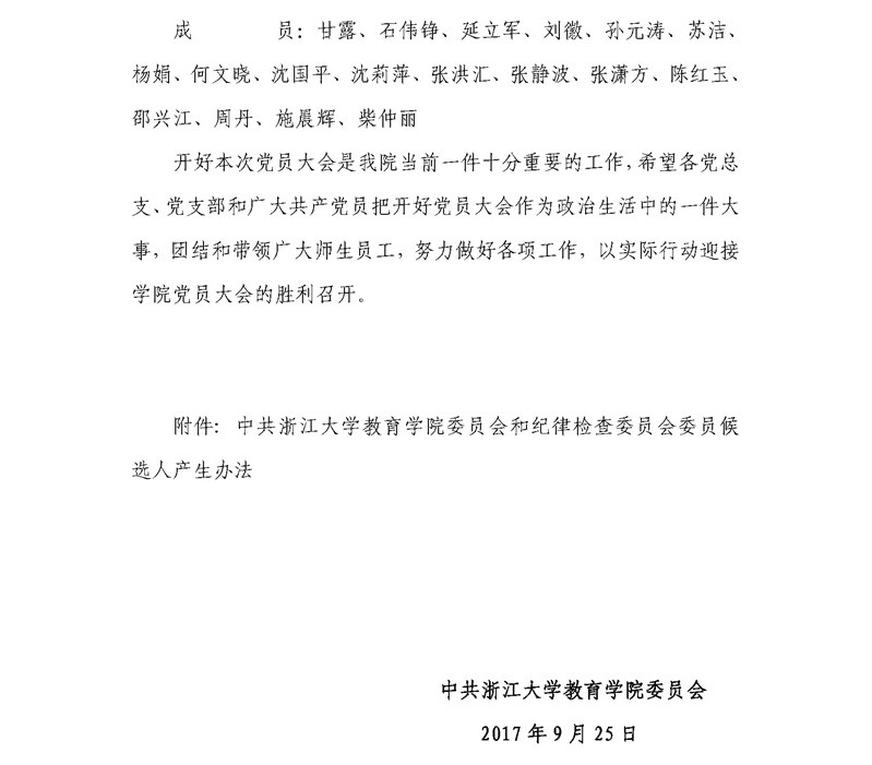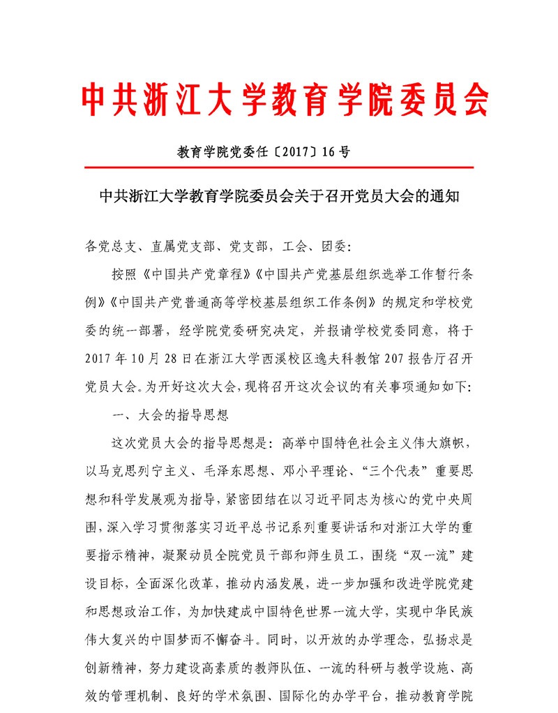 教育学院党委发〔2017〕16号:中共浙江大学教育学院委员会关于召开党员大会的通知