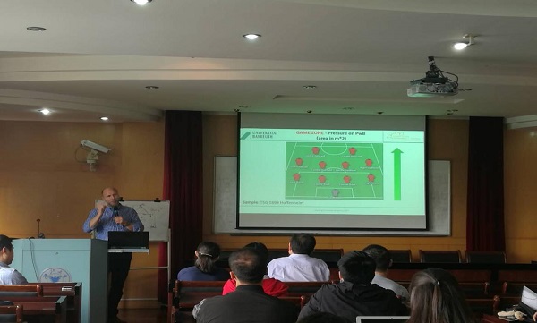 Hohmann教授首先介绍了他们目前正在研究的一项课题,青少年足球比赛中的“施压战术”问题,通过计算比赛攻守双方的“4×4”面积和攻守的距离,揭示足球比赛中“压缩空间”、“防守距离”与足球比赛结果之间的关系。这种新颖的研究方法(或者视角)引起了到场师生们的关注与思考。Hohmann教授还就师生们所提出的数据采集方法的合理性、可行性等问题进行了详尽的解答。